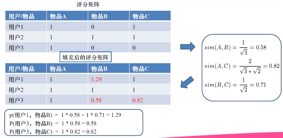 第二步:根据 公式,算出用户对缺失物品的评分。把所有的评分算好后,可以填充评分矩阵中缺失的值。