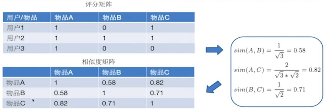 通过上面的计算,假如我们要对用户3进行推荐,得到用户3未操作的物品B的评分为0.58,未操作的物品C的评分为0.82,按照评分大小进行排序,生成有序的推荐集,那么用户3的推荐集为(物品C>物品B)。