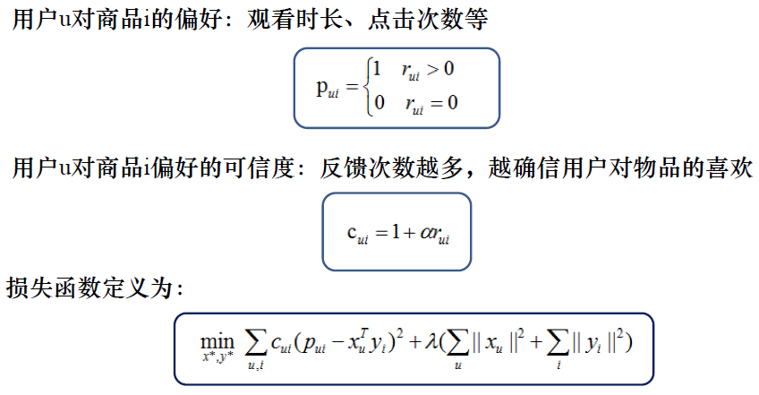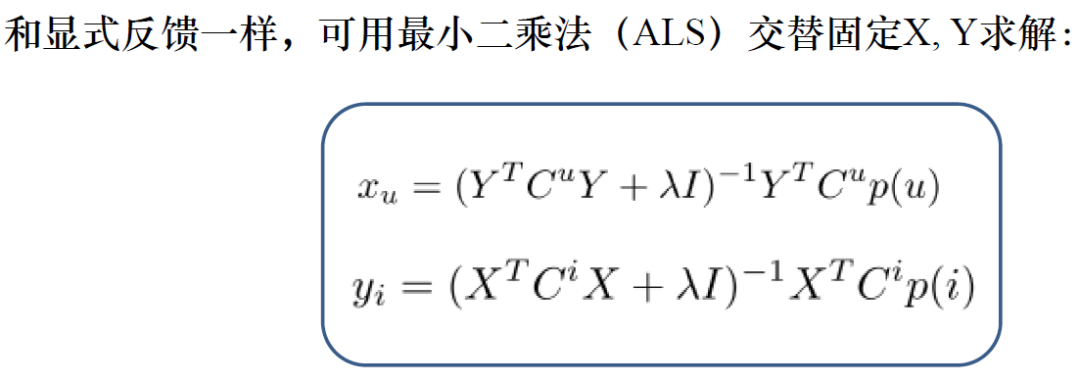 不管是显示反馈还是隐式反馈,只要定义好损失函数或者目标函数,就可以通过最小二乘法(ALS)交替求解 矩阵。
