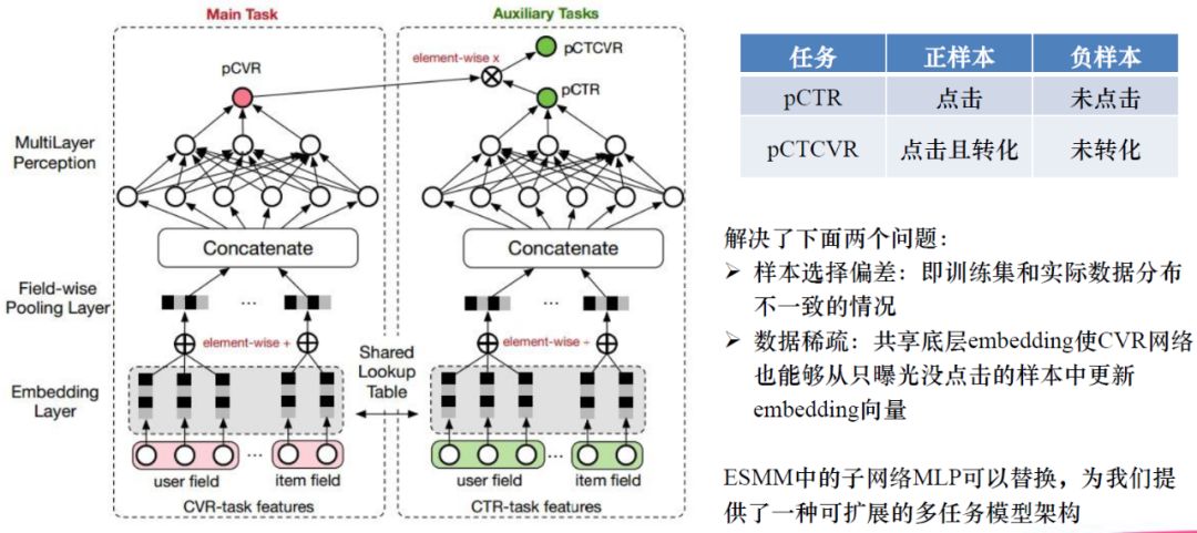 因此提出了浏览转化率公式,进而提出了上图所示的网络模型,一个双塔模型,它们是共享底层Embedding层的,只是上面的不一样,一个用来预测CTR,这个可以在全样本空间上进行训练。另一个是用来预测CVR,CVR是一个辅助任务。最后的CTCVR可以在全样本空间中训练。ESMM模型是一个双塔、双任务的模式在全样本空间上进行训练。这样训练的好处可以解决两个问题:一是,样本选择的问题,CVR是在点击的基础上进行训练,训练集只有点击的,实际数据可能有曝光点击和曝光未点击的数据,我们往往把曝光未点击的数据给忽略了,这样就造成了样本选择偏差,训练集和实际数据分布不一致的情况。二是,解决数据稀疏的问题。因为我们现在在全样本空间上进行训练,不是只在点击的样本上进行训练,所以样本就多了很多,所有样本可以进行辅助更新CVR网络中的Embedding,这样Embedding向量就会训练的更加充分。ESMM还提出子网络MLP可以替换,为我们提供了一种可扩展的多任务模型架构。