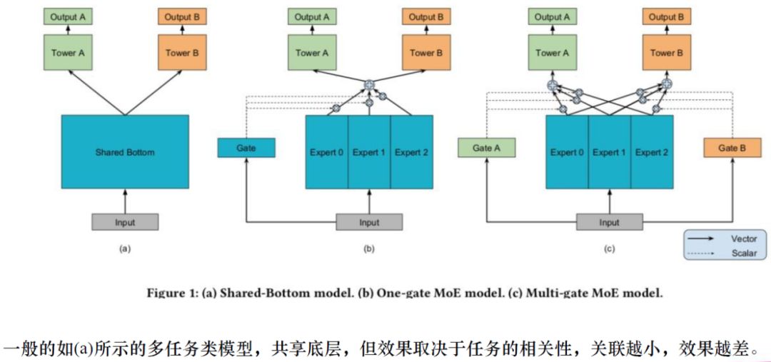 很多多任务模型是上图(a)这种模式,共享一个底层的Embedding之后,然后两个塔得到两个任务。但是它的使用表明如果多任务的相关性比较低的话,模型的效果就比较差。基于这种现象就提出了上图所示的(b)(c)专家网络,希望不同的任务可以从输入得到不同的东西,这就有点类似于Attention的部分了。用门来决定塔可以从输入拿到什么东西,这样的好处就是每一个Tower可以拿到不同的输入,这样就可以减少任务之间相互拖后腿的情况。这种架构也是目前比较常见的。
