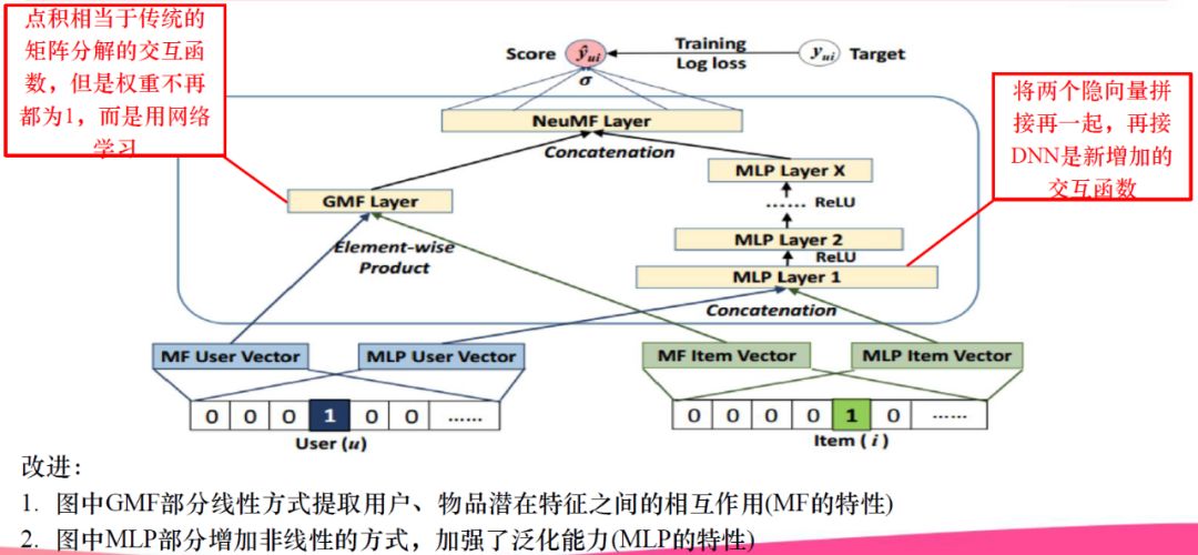这样做的好处是,GMF Layer保留了内积的方式NeuMF又引入了DNN的方式,结论表明这样做既可以增强传统矩阵分解的表现力又可以引入DNN自己的一些高阶特征交叉的特点进而引入了一定的泛化性。