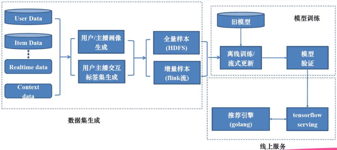 训练原始数据有用户数据、物品数据、实时数据和上下文数据。用这些数据解析成用户/主播画像作为训练数据,用户主播交互标签作为训练数据的label。离线训练的部分,就是上文所讲的训练集生成的过程。每天生成一天的训练样本,把多天的训练样本组合起来形成全量样本,满足覆盖度和数据量的要求。全量样本直接存储在HDFS上,以天或周的级别进行更新,这样可以保证模型的准确性。另一部分是增量样本,比如flink流,可以线上对模型进行流式更新,这样可以满足模型实时性的要求。模型验证模块,验证模型指标有没有达到我们期望的阈值,防止一些不好的特征把模型训练坏了,还推上线的情况。模型验证好之后,需要上线服务就可以用Tensorflow Serving这种框架来进行线上服务。推荐引擎用的是golang来处理用户的请求,以及将请求转化为特征,并把特征喂给Tensorflow Serving的一个流程。golang的性能比较高。