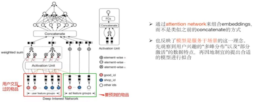 还有一个比较有代表性的工作是阿里的DIN模型(深度兴趣网络)。这个模型的特点就是,把NLP领域中的Attention Network引入进模型中。把当前要预测的物品与用户交互过的物品放到一个Attention层里,经过Attention层会对用户交互过的每一个物品学到不同的权重,然后进行加权平均拿到一个总的Embedding。Attention有效是基于这样一种现象:观察到用户兴趣的“多峰分布”以及“部分激活”的数据特点,举个例子,假如当前我们要预测的物品是一件衣服,用户的历史行为里面有各种各样的物品(衣服、吃的、玩的),我们预测衣服的时候,用户过去吃的和玩的物品对当前的衣服预测是没有参考价值的,只有过去交互过的衣服对于当前预测衣服是有价值的,Attention的作用就是对过去交互过的衣服赋予较大的权重,对吃的玩的物品赋予较小的权重,这样就可以减少其它类物品的干扰。DIN模型也反映了模型是服务于场景的这一理念。