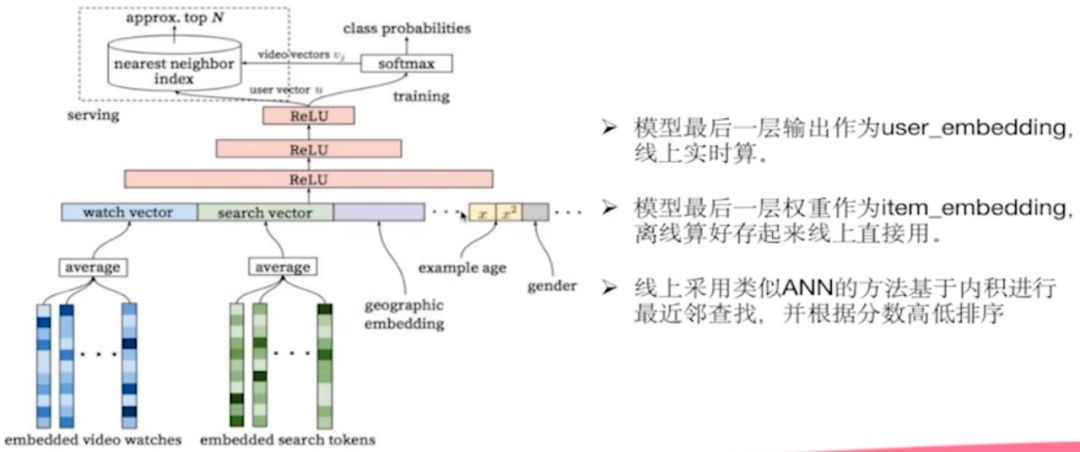 Youtube的召回模型是比较复杂的,上面提到的召回模型都是用到了用户和物品的id类特征,而Youtube模型用到了性别、地理信息、样本的时间和一些embedded特征等。这个模型的特点就是:模型最后一层的输出当作用户的隐向量,是在线上实时计算的,就是每次用户来经过嵌入层变成向量再到ReLU这样的网络得到一个输出作为用户的隐向量;最后一层的权重当作物品的隐向量,这一部分是离线训练好后直接存储起来,线上不用直接更新,直接拿出来用就行;这些线上拿到用户的隐向量以及存储的物品隐向量以后,做一个基于类似最近邻查找的方法基于内积进行最近邻查找,其实就是把用户隐向量和所有物品隐向量做内积,然后根据内积进行排序。