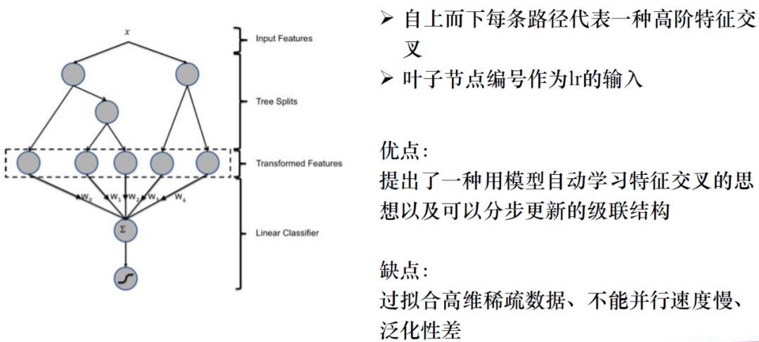 GBDT+LR的优点是提出了一种用模型自动学习特征交叉的思想,这个是很重要的改进。因为人工特征交叉成本太高,用模型自动学习特征交叉的思想很重要。后来深度学习兴起以后,各种Embedding特征交叉也算是这种思想的延伸。GBDT+LR模型还提出分步更新的级联结构,因为模型分为两部分,不是联合训练的,是分步训练的,先训练树模型,然后叶子节点编好号,再训练LR模型。