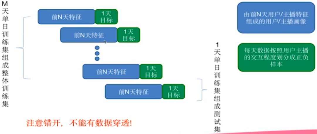当然,只用一天的数据作为训练样本肯定不够。因为用户不能保证每天都来,主播也不能保证每天都在。所以,我们要以上述的方式选出M天数据,把M天训练数据组成整体训练集。这样一方面可以保证数据量的要求,另一方面也能保证用户和主播覆盖度的要求。