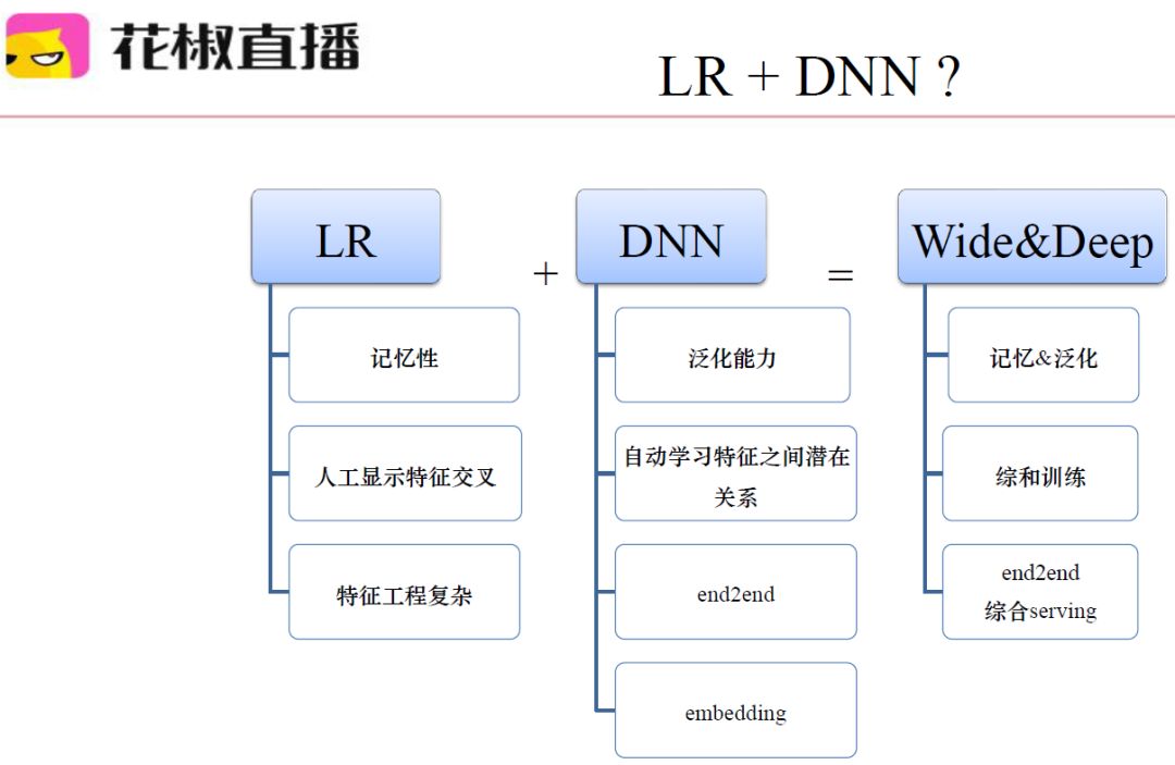有LR模型还有DNN模型,自然有研究者就把这两者结合在一起。因为LR的好处就是记忆性,缺点就是人工特征交叉、特征工程复杂;DNN的好处就是泛化能力强、可以自动学习特征之间潜在关系、是一种端到端的模型。所以把它们两个结合在一起后,即兼顾了记忆性、泛化性,还能端到端的训练,serving起来也是比较简单的。