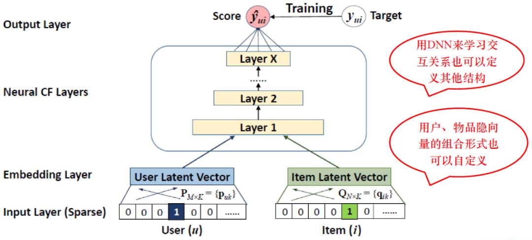 随着深度学习的兴起,有学者提出了新的模型:即借鉴深度学习中的方法,使用深度神经网络 (DNN) 从数据中自动学习用户/物品隐向量的交互函数(即内积函数),在增强表现力的同时也可以引入一定的泛化能力。示例:NCF框架。(Neural Collaborative Filtering)