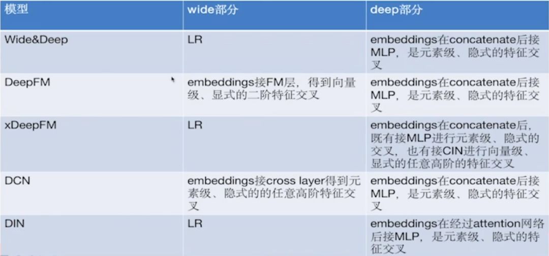 还有一个特点在特征交互层。特征交互层的wide部分可以用LR,也可以用FM,还可以用Deep & Cross Network中的交叉网络。特征交互层的Deep部分,根据交互方法可以分为隐式/显示、元素级/向量级、二阶/高阶。隐式的比如DNN这种,直接是全连接。显示的比如说FM这种,每个特征都带一个Embedding,可以把不同特征的Embedding以向量级的形式显示的两两交叉。全连接就是元素级,FM就是向量级,向量级不会把特征的Embedding每一位拆开,向量级是直接把两个特征的Embedding以向量的形式做内积。二阶交叉就像FM这种的,典型的只有二阶交叉。高阶交叉就像XDeepFM,它可以调节CIN网络的个数来达到你想要的任意阶的交叉。