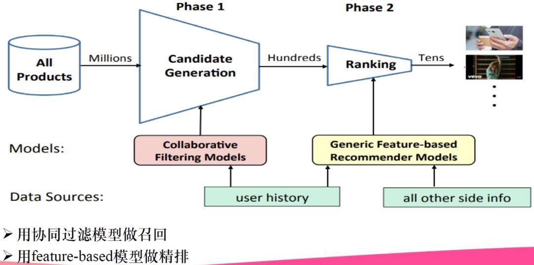 现代化推荐系统可以分为以下阶段:首先,从百万量级的全样本数据中通过粗排序模型(召回模型) 生成百千级别的候选集;然后,通过精排序模型生成百十级别的候选集展现给用户。可以看到,粗排一般用到的是比较简单的如协同过滤模型等,并且一般只用到用户的历史行为数据作为特征。精排一般用一些基于特征的推荐系统模型,如深度类型的模型wide&deep,除了用到用户的历史行为数据,还用到各种各样的旁路信息。