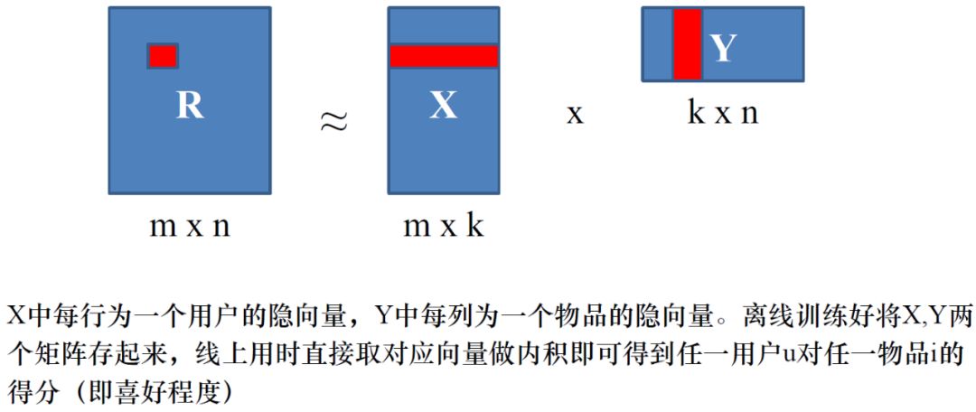中每行为一个用户的隐向量, 中每列为一个物品的隐向量。离线训练好后将 两个矩阵存起来,线上用时用户来了取出用户的隐向量,然后取出在线的主播的隐向量,算一下用户向量和主播向量的内积,内积也就是得分,最后根据得分的高低进行排序。