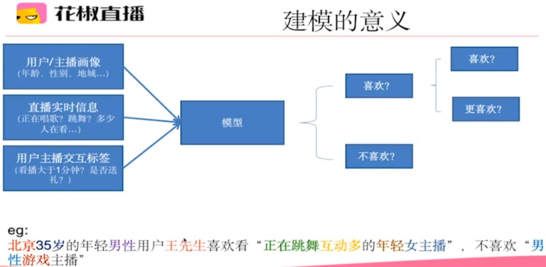 比如上图中的例子,我们希望模型学到这样的效果:北京35岁的年轻男性用户王先生喜欢看“正在跳舞互动多的年轻女主播”,不喜欢“男性游戏主播”。这里面“北京”、“35岁”、“男性”、“王先生”(id类特征)是用户特征,“正在跳舞”、“互动多”、“年轻”、“女主播”是主播特征。我们希望通过许多样本,让模型学出不同用户的喜好。