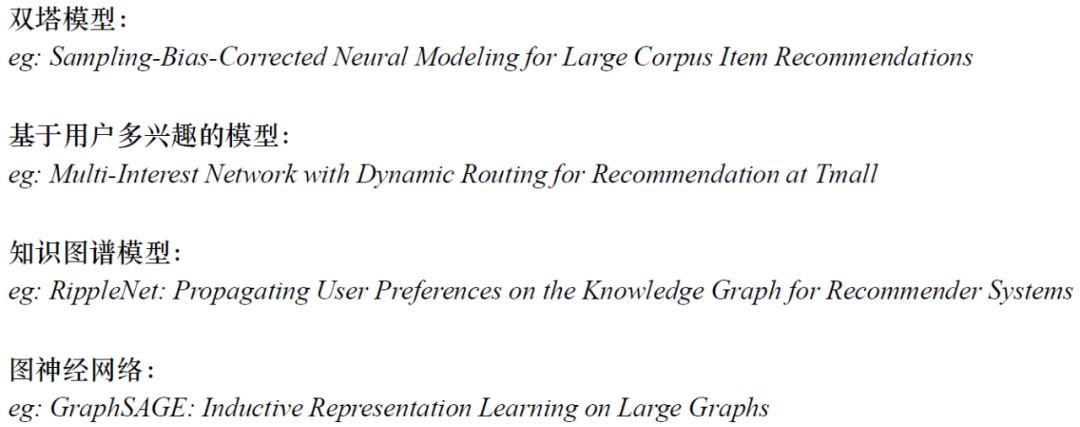 其他比较火的召回模型,比如说双塔模型,基于DNN或FM的双塔模型,这种模型的特点就是用户和物品各一个塔,从这两个塔中得到用户和物品的隐向量,在线上也是用两个隐向量进行内积得到用户对物品的得分,然后对得分进行排序。除此之外,其他召回模型还有基于用户多兴趣的模型、知识图谱模型和图神经网络等。这些模型都是比较新、比较潮流的,感兴趣的话可以根据自己的场景进行试验。