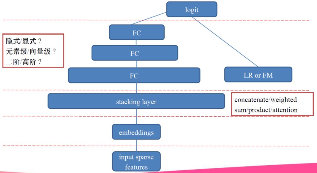 首先输入离散特征转化为Embedding,所有的Embedding经过stacking layer级联在一起。stacking layer有很多级联方式,比如说最简单的concatenate,像前面讲的DNN那样,把所有embedding横向拼接在一起,然后接全连接层。还可以加权平均,比如某用户浏览过十个物品,十个物品对应十个embedding,我们可以直接加起来求平均值,当成一个特征。还有也可以做内积或者外积,这里也有对应的网络。还有复杂点的,可以做Attention,像DIN一样,把当前物品和用户交互过的物品一起放到Attention网络里面。根据这一层的不同可以划分出好多网络模型。