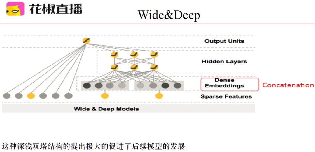 从上图的Wide&Deep模型中可以看出,左边是一个LR,右边是一个DNN。这种深浅双塔结构的提出极大的促进了后续模型的发展,后续很多模型都是基于这个模型的改动。