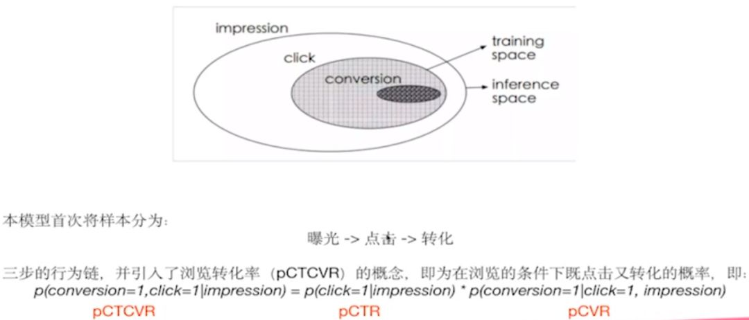 ESMM模型首次把样本空间分成了三大部分,从曝光到点击再到转化的三步行为链,并引入了浏览转化率(pCTCVR)的概念。我们正常做CVR任务的时候,默认只在点击的空间上来做,认为曝光、点击并转化了就是正样本,认为曝光、点击并未转化为负样本。如果这样想的话,样本全空间只有点击的样本,而没有考虑没有点击的样本。ESMM论文就提出曝光点击、曝光不点击以及点击之后是否转化所有的这些样本都考虑进来,因此提出三步的行为链,提出如下公式: