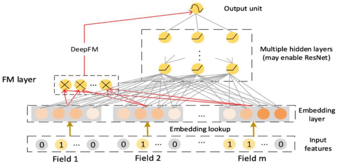 既然LR能和DNN结合,自然又有研究者想到FM也能和DNN结合,这就是DeepFM模型。与Wide&Deep模型的区别在于把左边的LR换成了FM,这样即能保证有LR部分的特点,还能多一个二阶自动交叉的FM特点。
