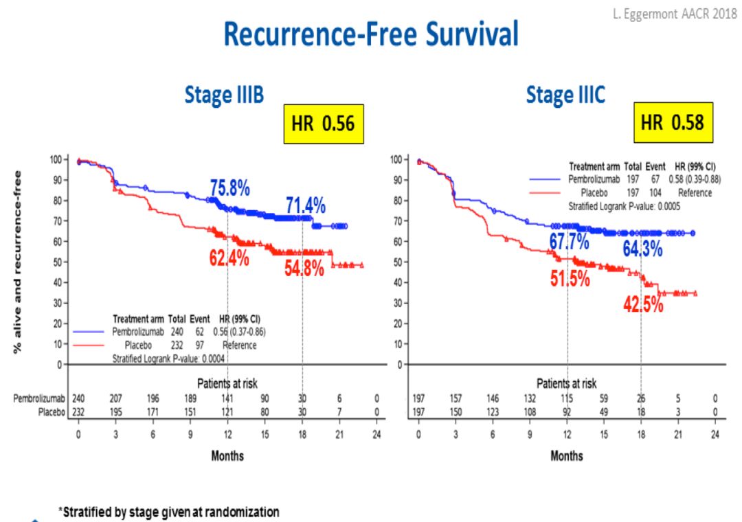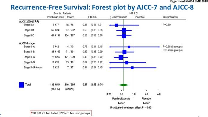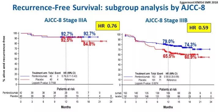 在今年的SMR(黑色素瘤研究者大会)上,学者应用了AJCC 8th的新分期系统,重新评估了KEYNOTE-054研究的结果,得到了一些有趣的提示,结果发现作为复发风险较低的IIIA人群,反而较IIIB和IIIC患者更能够从免疫治疗中获益。经过了AJCC 8th的重新分析后,IIIA-IIIC人群随着肿瘤负荷的不断加重,能够从免疫治疗中得到的益处更多。这说明新的分期系统能够更好地评价辅助治疗的效果。