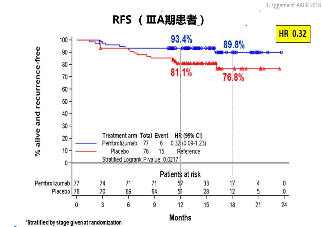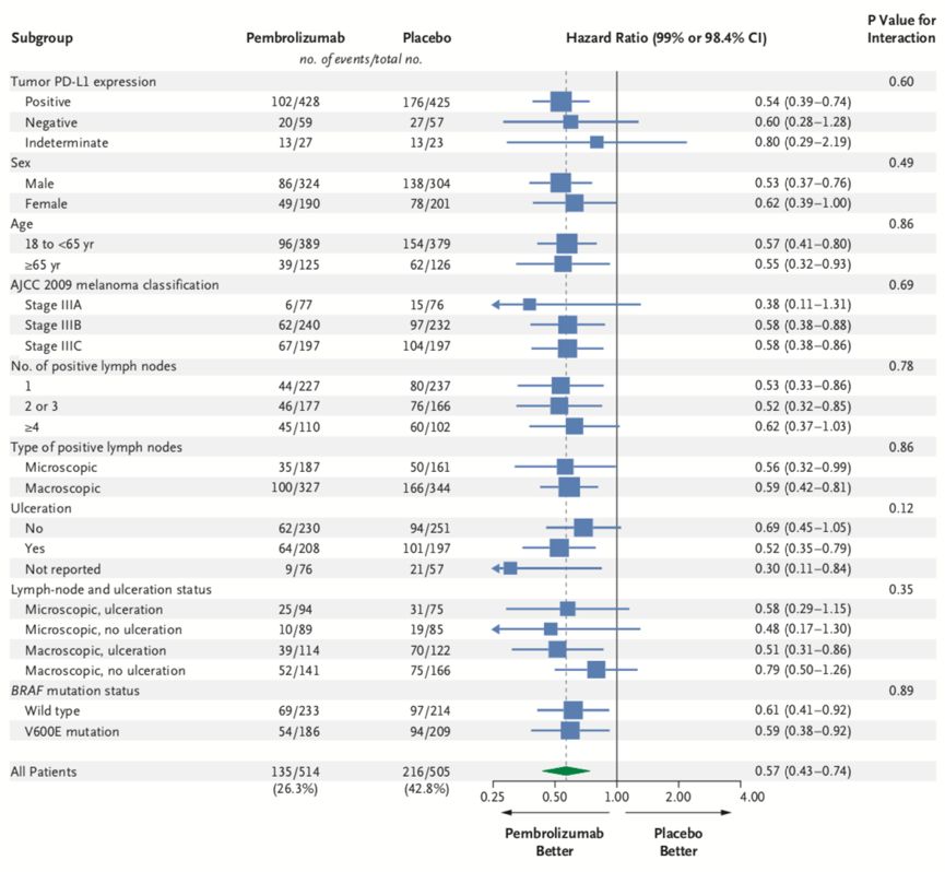 研究结果发现,帕博利珠单抗相对安慰剂显著延长了III期黑色素瘤的术后无复发生存(1年的RFS,75.4% vs 61.0%,HR 0.74,P<0.001)。任何分层分析中的亚组都更倾向于免疫治疗。其中,肿瘤内PD-L1表达阳性的患者从免疫治疗中获益更多(1年RFS,77.1% vs 62.6%,HR 0.54,P<0.001)。从分期分层来看,IIIA期的低危患者反而较IIIB和IIIC期,更能从免疫治疗中的获益。