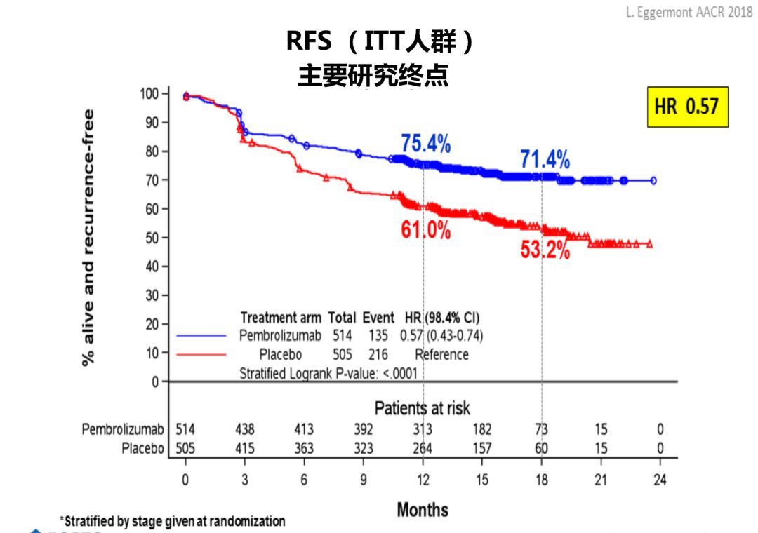研究在北美、欧洲、澳洲等23个国家或地区的123家临床中心开展,纳入接受手术切除的III期黑色素瘤人群,随机分成两组,试验组接受帕博利珠单抗辅助治疗,方案为200mgQ3W,1年;对照组以相同的治疗频率给予安慰剂治疗。1年后停药随访直至出现复发。试验组若复发在免疫治疗结束6个月以上,可以再次接受免疫治疗,对照组复发的患者可交叉至免疫治疗。研究终点为无病生存率。