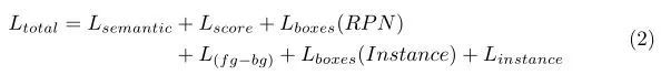 Lsemantic和Linstance是categorical cross-entropy loss 和binary cross-entropy loss;Lboxes(RPN)和Lboxes(Instance)是L1正则化损失和L1(t-t*)。L(fg-bg)是不同类之间的简单log损失。