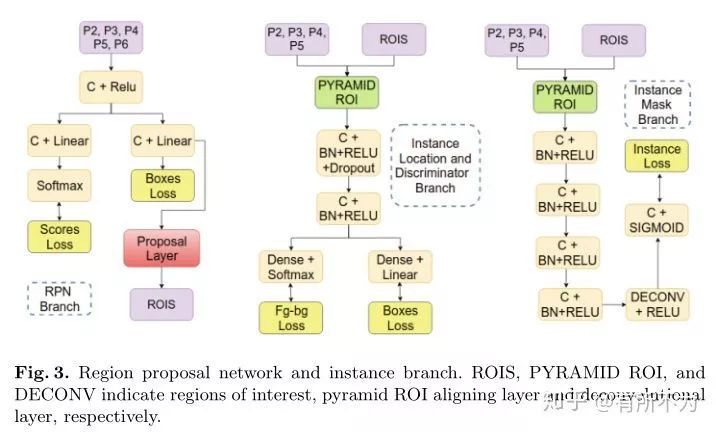 实例分支包含实例定位和鉴别分支以及实例掩码分支。实例定位和鉴别分支进一步的改进边框的位置和评估每个物体的可能性(是前景还是背景)。(The pyramid ROI)金字塔式感兴趣区域归一层根据感兴趣区域的大小选择相应的feature map层次。在这里,我们不使用特定于类的损失,而是使用前景-背景损失。这个特殊的设计试图使用相同的网络从不同的类中分割单元格。