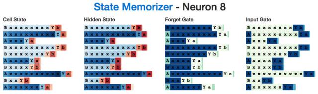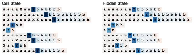 有趣的是,尽管在神经网络读到分隔符"Y" 之前,我们并不需要了解A状态与B状态的情况,但是隐状态在读取所有中间输入的整个过程中都处于激活状态。这似乎有些“效率低下”,或许是因为神经元在计算x's的数量时还在完成一些其他的任务。