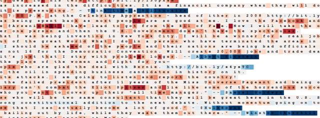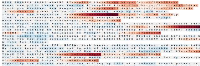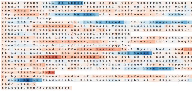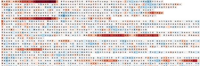 最后让我们再看一个实例,这个实例是用特朗普总统的推文训练出的2层LSTM。尽管这个数据集很小,但是足以学习很多模式。例如,下面是一个在话题标签、URL和@mentions中跟踪推文位置的神经元: