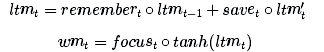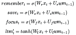 在时间t时,我们收到一个新的输入xt。我们还将长期记忆和工作记忆从前两个时间步ltmt−1和wmt−1(两者都为n-长度向量)传递到当前时间步,进行更新。