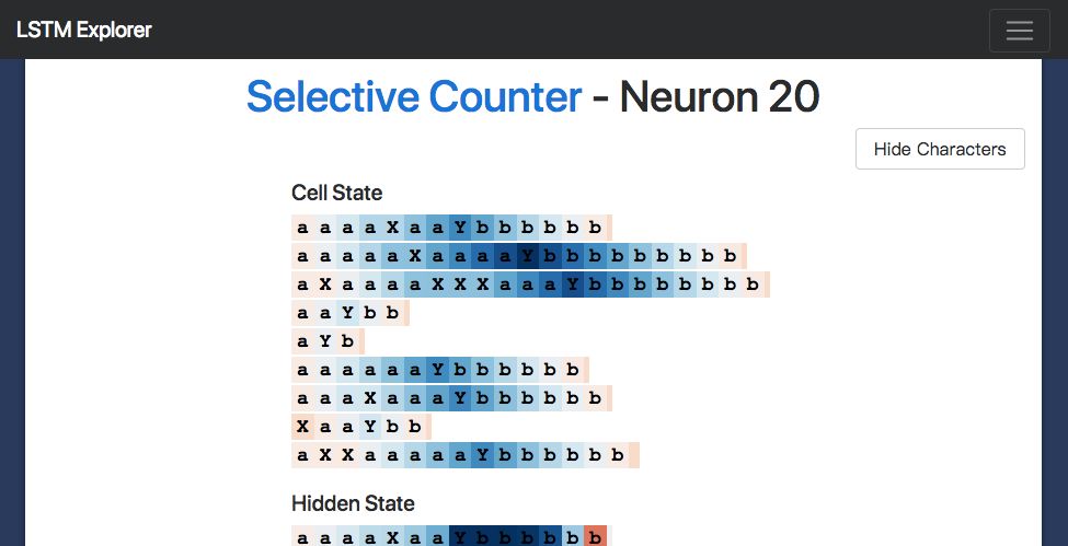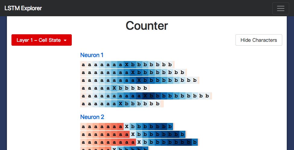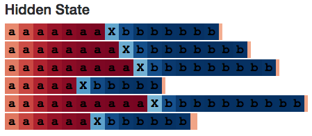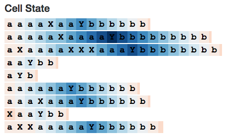 我用LSTM开发了一个小的网页应用(http://blog.echen.me/lstm-explorer),Neuron #2计数的似乎是它所能看到的a's和b's的总数。(记住根据神经元的激活状态对Cell进行上色,颜色在暗红色 [-1] 到暗蓝色 [+1]之间变化。)