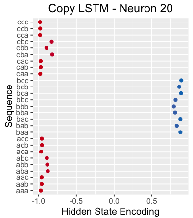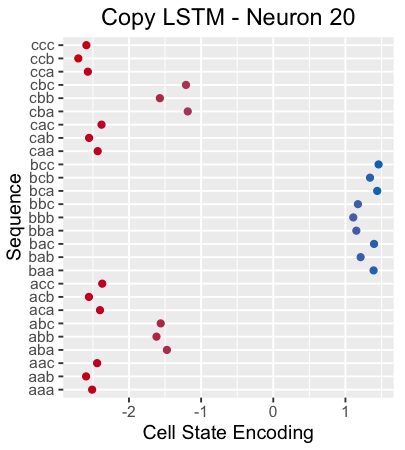 再举一个例子,下图是神经网络读取分隔符"X"时神经元20的隐状态。该神经元似乎能挑选出以"b"开头的序列。