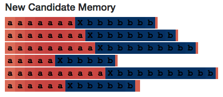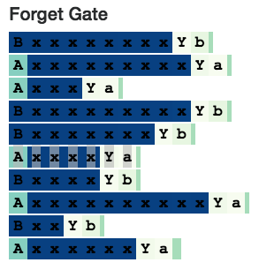 有趣的是,候选记忆在读到不相关的X's时完全激活——这表明了设置输入门的必要性。(但是,如果该输入门不是模型结构的一部分,那么该神经网络则很可能会通过其他方法学会如何忽视X's,至少在当下简单的实例中是这样的。)