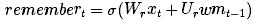 记忆向量remembert通常被称为记忆门(尽管记忆门中的1仍表示保留记忆,0仍表示忘记),表示为ft。