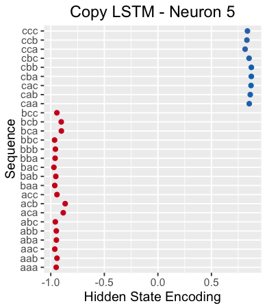 例如,下图绘制了神经网络读取分隔符"X"时神经元5的隐状态。该神经元显然能够从不同序列中区分出以"c"开头的序列。