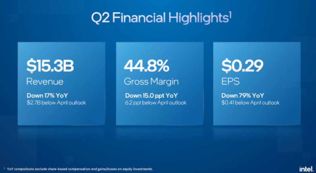根据不久前发布的季报,英特尔Q2每股收益调整后仅为29美分,而此前分析师的预期为每股70美分。当季营收为153.2亿美元,分析师预期为179.2亿美元。
