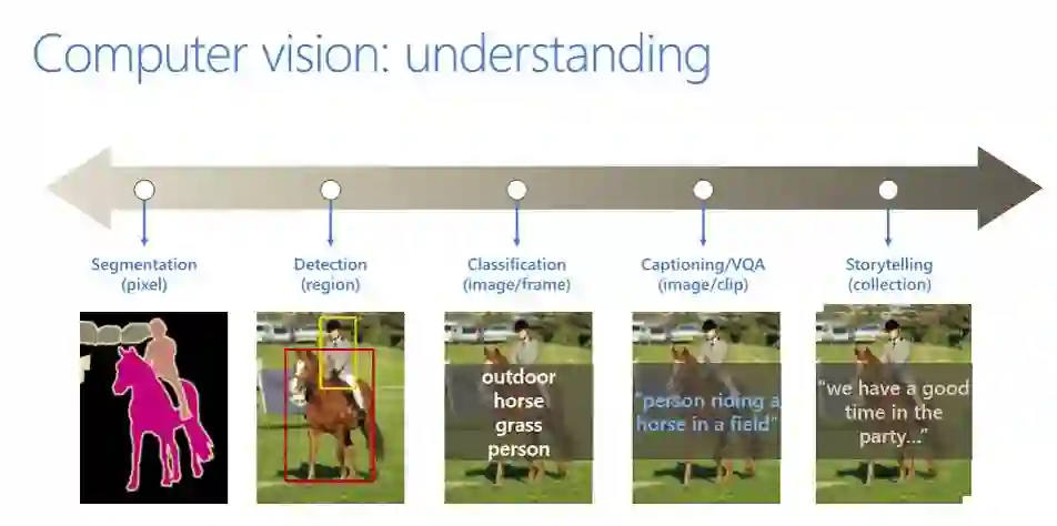 我们今天讲的是视频理解,如果从理解一个像素或理解一个图片或视频来说,可以把这个理解问题分成几个层次。最难的是需要理解图片或视频里面每个像素代表什么标签。再往上是我们关心每一个物体在什么位置、属于什么类别。第三部分是不关心这个物体在什么地方,你给我一图片或者视频,我就知道这个图片或者视频里面有什么标签。再往前走一步,比如说我给你一个图片,要求不仅要生成单独的标签,还要看你能不能生成一个非常自然的语言来描述这个图片。再往上,我给你一个图片,能不能给我一个故事,比如说现在机器能不能产生这样一个故事。