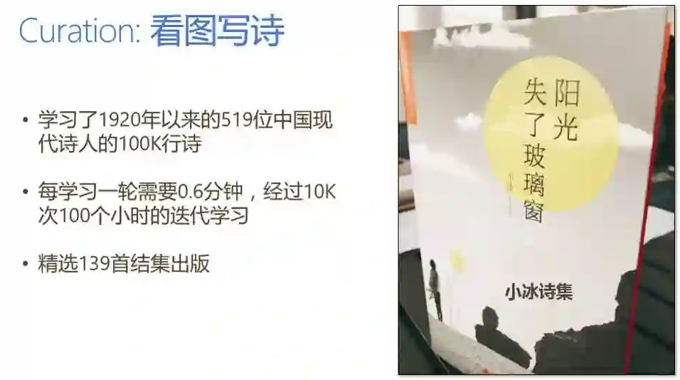 小冰还可以写诗,最近我们发表了一个小冰诗集。小冰说:“看那星,闪烁的几颗星,西山上的太阳,青蛙儿正在远远的浅水,她嫁给了人间许多的颜色”。
