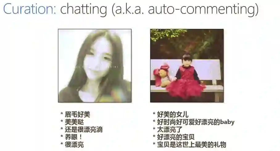 这是我们生成的一个视频(见PPT)。小冰能够做auto-commenting(自动评论),不仅告诉你很美,还能告诉你美在什么地方。后面是一个小孩子,它说你的女儿很漂亮、很时尚。基本上它可以给自拍的视频做评论,给小孩的视频做评论,也可以给宠物视频做评论。