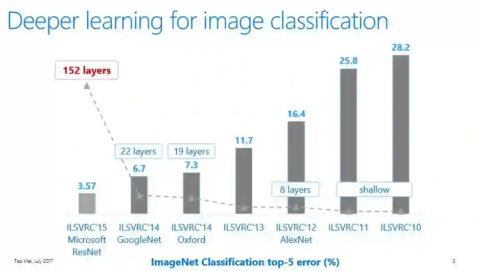 大家看一下这个图(见PPT),Image Classification(图像分类)从最早8层到20多层,到现在我们的152层。我们在微软做了很多工作,image里面有很多image recognition computational style transfer(图像识别计算的风格转换)等等。微软跟这个相关的产品有很多,比如说小冰不仅可以跟你用文字聊天,还可以通过图片和视频跟你交流。从图像到视频,理解一个视频必须理解每一个帧里面的运动。为什么今天要谈论视频呢?