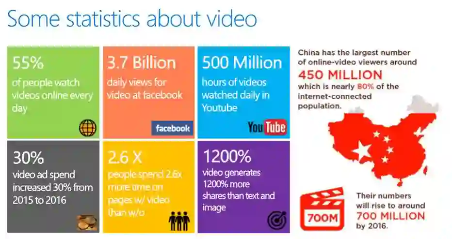 全世界现在每天有超过50%的人在线看视频,每天在Facebook上会观看37亿个视频,YouTube上每天会观看5亿小时时长的视频。我们做视频,大家首先想到的就是做广告,视频上面的广告每年都是30%的速度递增的,在YouTube上面也是每年30%的增长态势。人们在视频上花的时间是图片上的2.6倍。视频的生成比文字和图片要多1200%。2016年中国视频用户超过7亿。