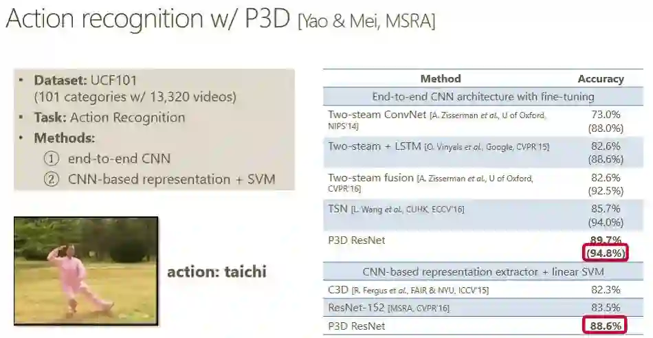 这是我们今天讲的唯一的一个技术性的部分。我们最近做的一个非常好的工作,就是可以做深层次的网络,我们可以通过一些方式使得深层次的网络是可行的。比如说这个到现在可以做到152层,也可以做到1001层,性能超过了任何网络。我们能不能从这个网站的图片扩展到视频?我把二维的卷积盒变成三维的,当它卷积的时候是沿着X、Y和T这个方向卷积的。C3D模型是可以做到13层,它非常复杂。我们有一个想法,把它进行分解,一个是可以找出这个物体的数量,使的这个过程可行,另外还可以在图像上进行处理。我们做了很多工作,比如说这个视频是一个太极的动作,我们通过P3D可以找出来4个点,这个已经非常了不起了。
