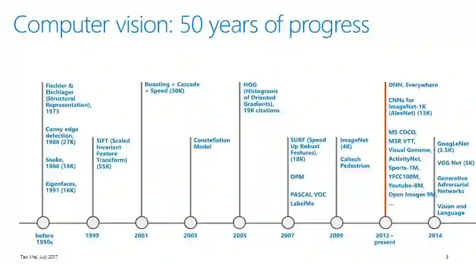 大家可以从这个图中看到CV的一些进展,举几个例子,比如说这篇论文SIFT(Scaled Invariant Feature Transform)文,已经被引用55000次了。另外,如果大家做人脸识别就会知道,需要定位人脸的区域。我们2001年有一个方法是Boosting +Cascade,做快速的人脸定位。到今天为止,虽然大家知道做人脸定位有很多深度学习的方法,但是这个方法依然是最先的必经的步骤之一。这个论文到目前为止已被引用了30000次,在学术界有一篇论文被引用超过10000次已经是相当了不起了。到了2012年以后,基本上所有人都在用深度学习,从Hinton的学生用AlexNet在ImageNet上面能得到近乎15%的错误率,从那开始,所有视觉的东西都在用CNN,代表性的有GoogLeNet,AlexNet等等,我们的任务也会越来越多,越来越有挑战,比如现在正在做的从图片中生成语言,不仅要在图片或视频中打上一些标签,还要把这些标签变成能用自然语言描述的一句话。