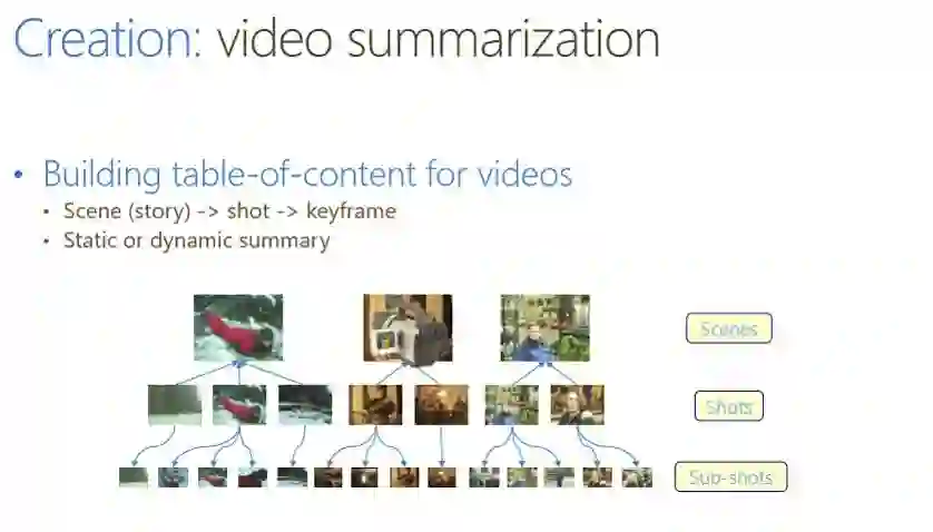 要讨论视频的创作,这里面涉及到一个基本概念,那就是视频的产生原理。“Video的产生是先把Video切成一个一个的镜头,可以看成是一个一个断码,然后每一个镜头再组合编成一个故事或场景,每一个镜头还可以再细成子镜头,每个子镜头可以用一个关键帧来代表。通过这种分层式结构可以把一段非线性的视频流像切分文章一样进行结构化,这种结构化是后面做视频处理和分析的基础。通过这种结构化将视频分解成不同的单元,就可以做视频的自动摘要,即将一段长视频自动剪辑为精彩的短视频,或将一段长视频用一些具有高度视觉代表性的关键帧表示。这些摘要使得用户对长视频的非线性快速浏览成为可能。”