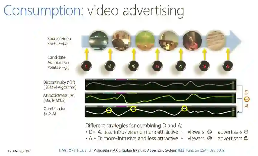 讲一下最后一个题目,这个广告是我十几年前加入微软的项目。那时候我们做的视频广告有两个问题需要解决:第一个问题是广告到底放在视频的什么位置;第二个问题是选什么样的广告,这个广告跟你插入点的信息是不是相关,使得用户接受度更加好。这两个问题怎么解决?当时我们提出一个方案,我来了一个视频,把这个视频分解,我们有几个值,第一个是discontinuity(不连续),看每一段是不是可以做广告,它的间断点使得用户的接受度更好。还有就是在是激动人心的阶段放广告。另外一个是Attractiveness(吸引力),让它变得可计算,当时我们有两个曲线,这两个曲线有不同的方式,第一种方式是要符合广告商的需求。