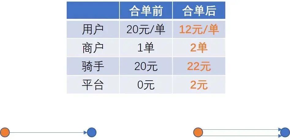 我们会发现,经过这样调度之后,配送员提升了一倍的效率;而与原来单个订单相比,配送员跑的路程不变,但各方都获得了更多利益: