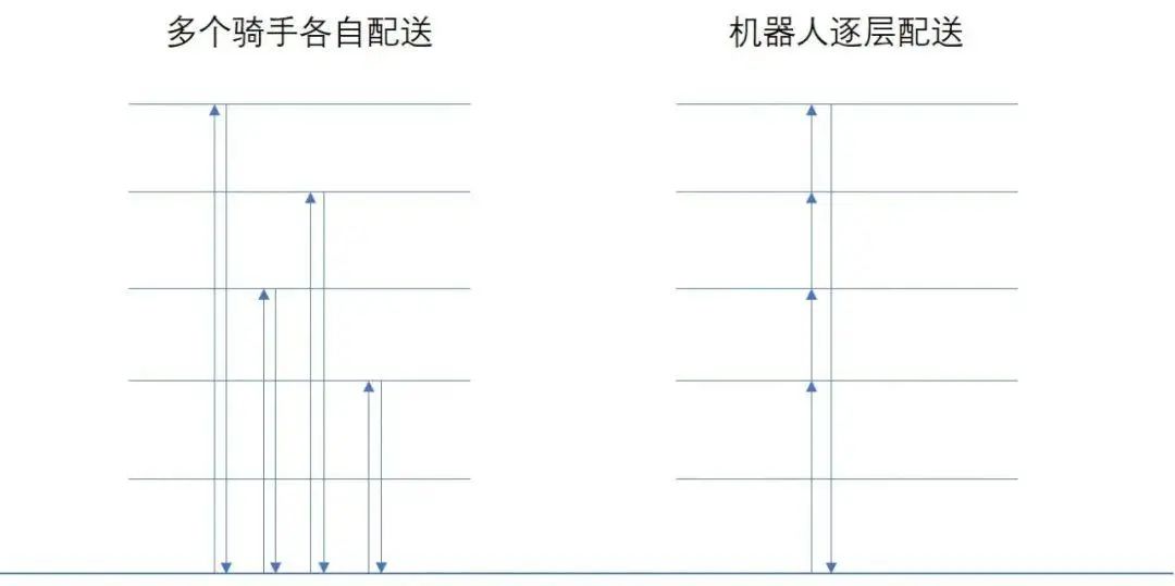 如果这时,能够有一台室内配送机器人,将这些外卖归集到一起,接下来再通过电梯或楼梯依次配送给每个用户,考虑到多人等电梯的时间损耗,这样的方案可能会更优: