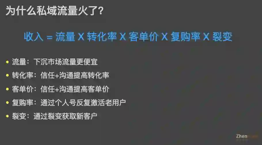 所以电商收入公式里每一个环节都可以通过流量下沉提高,这是私域流量在今年比较火的一个原因。