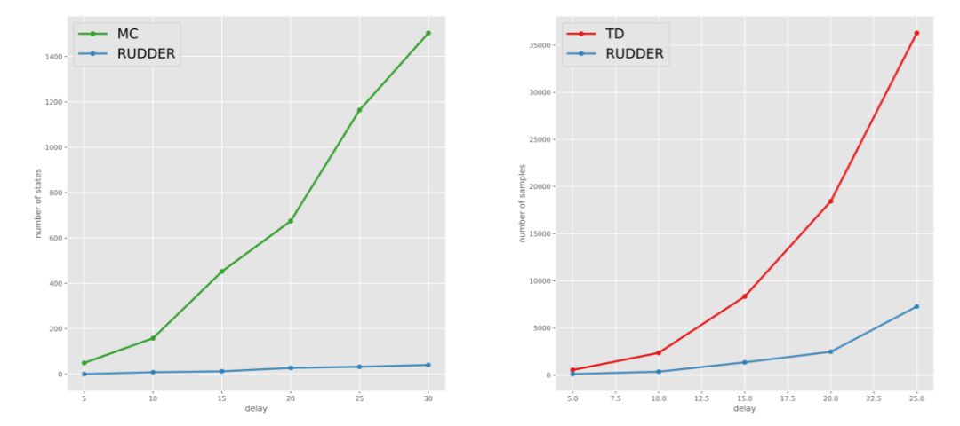 图 2:不同方法在不同延迟下学习达到 90% 返回奖励的最佳策略的观察状态数(对数坐标)。我们对比了由 Q 学习实现的时序差分(TD)、蒙特卡洛(MC)、蒙特卡洛树搜索(MCTS)和 RUDDER。左:Grid World 环境。右:Charge-Discharge 环境。RUDDER 和其他方法所需状态的差距随着延迟步数的增加呈现指数级增长。