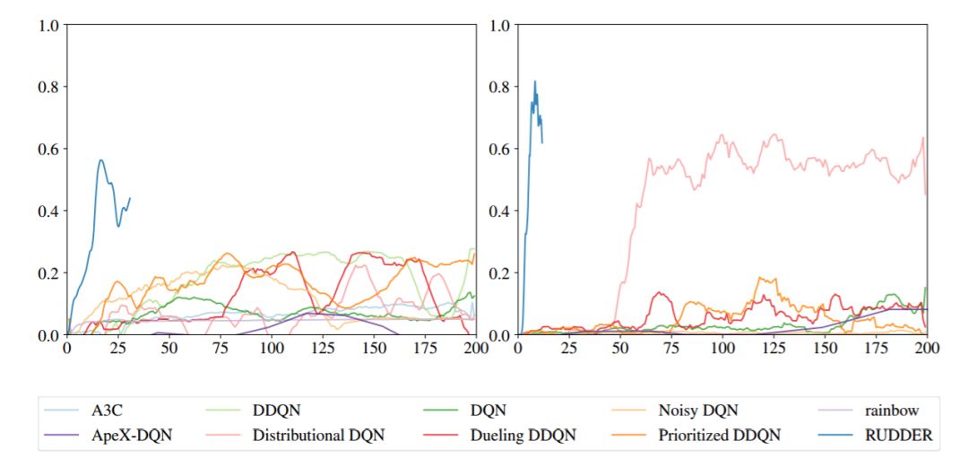 图 3:RUDDER 学习 Atari 游戏 Bowling 和 Venture 的延迟奖励的速度比其他方法快。左图是 Bowling 游戏训练过程中各个方法的归一化人类得分,右图是 Venture 游戏训练过程中各个方法的归一化人类得分,其中学习曲线来自于之前的研究 [39, 50]。RUDDER 在 Bowling 游戏上达到了新的当前最优性能。